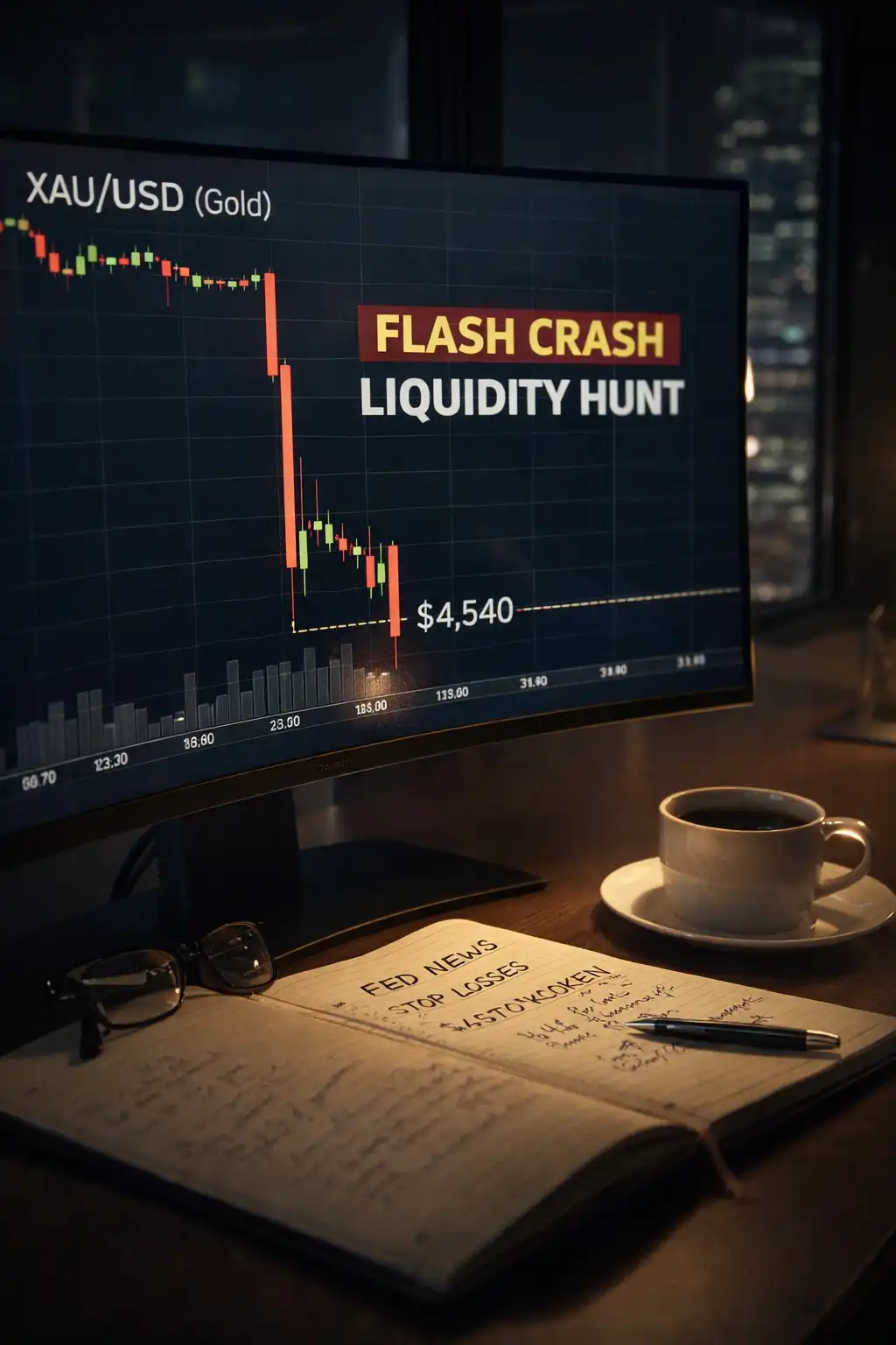 আজকের গোল্ড মার্কেটে (XAU/USD) আমরা যা দেখলাম, তাকে ট্রেডিংয়ের ভাষায় বলা হয় 'লিকুইডিটি হান্ট' (Liquidity Hunt)। মাত্র একটি ক্যান্ডেলে দাম $৪,৬৫০ থেকে সোজা $৪,৫৪০-এ নেমে আসা কোনো সাধারণ ঘটনা নয়। অনেক বিনিয়োগকারীই আতঙ্কিত হয়ে পড়েছে4qন, কিন্তু একজন অ্যানালিস্ট হিসেবে আমি বলবো—এর পেছনে ছিল অত্যন্ত শক্তিশালী কিছু ফান্ডামেন্টাল ট্রিগার।